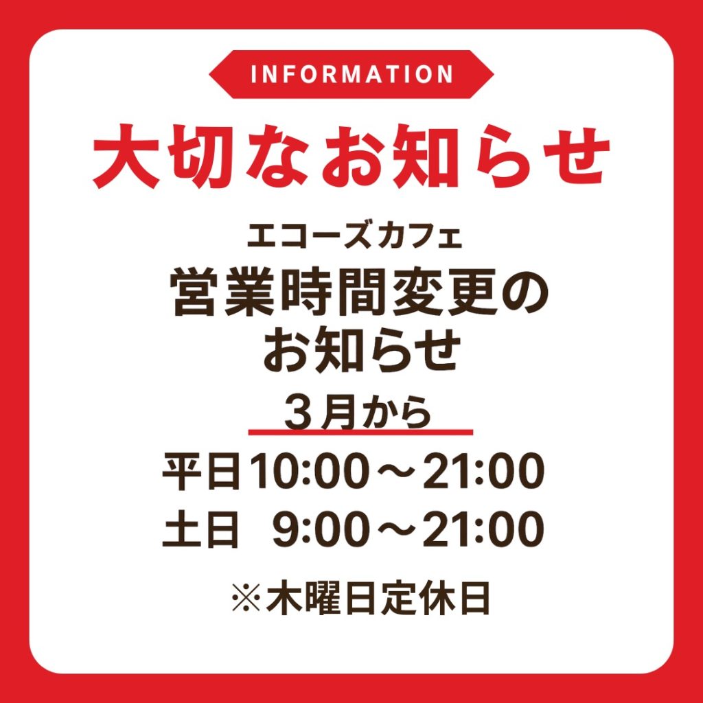 このたびエコーズカフェでは、2026年3月より営業時間を下記の通り変更させていただくことになりました。