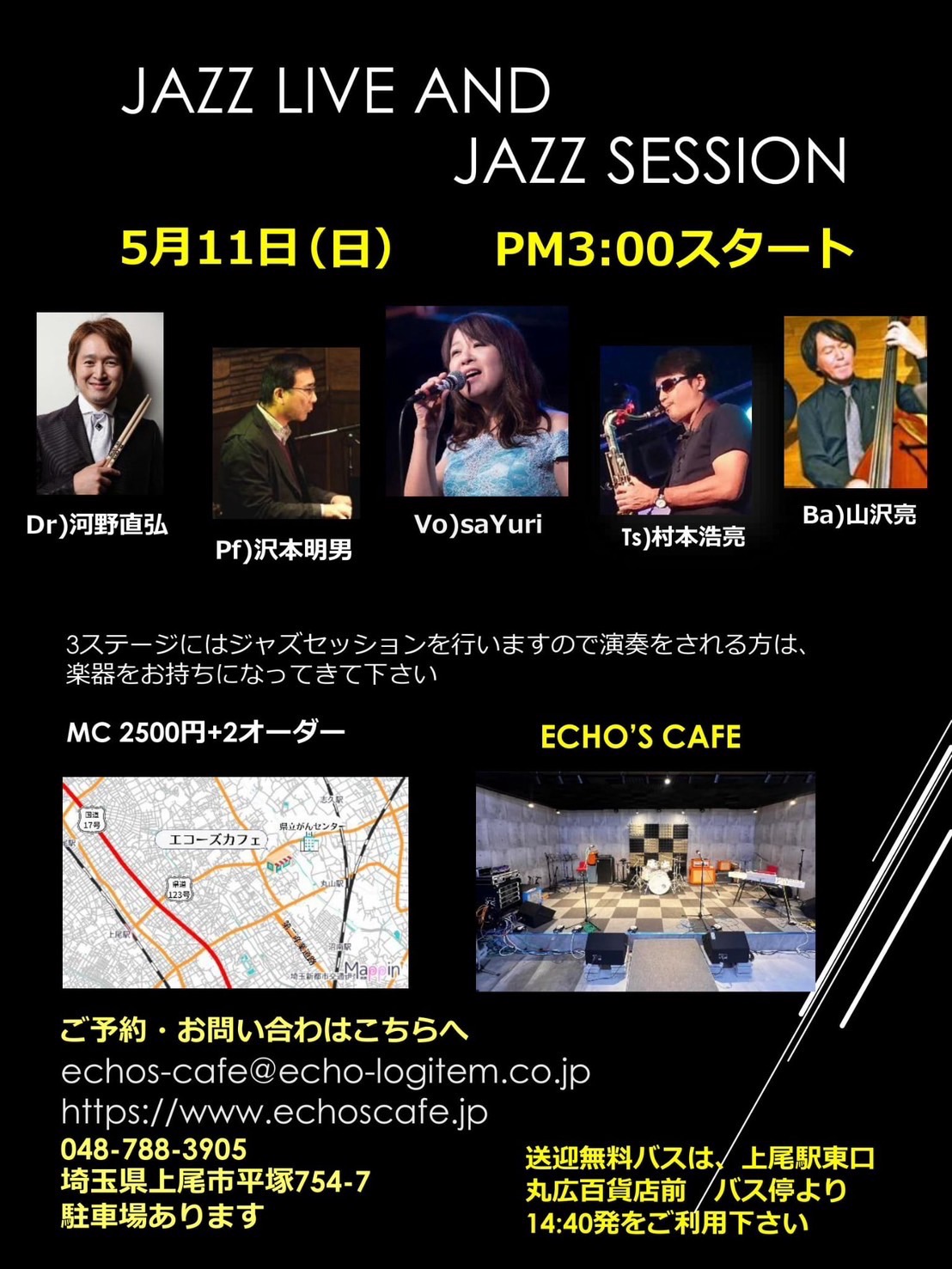 5月112025 JAZZ LIVE & JAZZ SESSION 3ステージのラストステージにジャズセッションをやりますので、演奏される方は、楽器をお持ちください。 MC:2500円+飲食チケット1,000円 ご予約・お問合せはエコーズカフェにお電話にて承ります。 TEL 048-788-3905