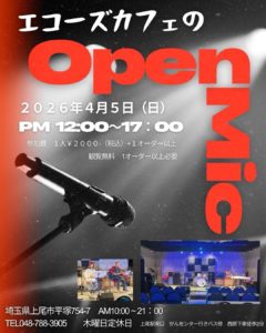4月052026 Open Mic エコーズカフェのOpen Mic 2026年4月5日(日)PM 12:00〜17:00 参加費 1人¥2000-(税込)+1オーダー以上 観覧無料 1オーダー以上必要 埼玉県上尾市平塚754-7AM10:00〜21:00 TEL048-788-3905木曜日定休日 上尾駅東口 がんセンター行きバス停西原下車徒歩2分