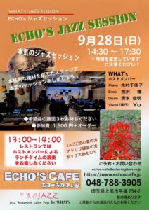 9月282025 WHAT’s JAZZ SESSION 9月28日(日) 14時30分~17時30分 イベントホスト P.木村千佳子 B.熊沢博 Dr.清水俊明 Vo.Yu 参加費1,500円+オーダー JAZZ初心者の方、アドリブ練習の方、ポップス曲もOK ご要望に応えるバック演奏から、お悩み相談もホストメンバーがしっかりサポートします。 バーカウンターで飲みながら演奏を楽しめます。 希望曲の譜面3枚をご持参ください。 【ご予約・お問合せ】 TEL 048-788-3905